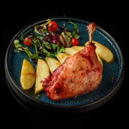 Ножка утки, хрустящая снаружи, нежная внутри (конфи) со смородиновым соусом