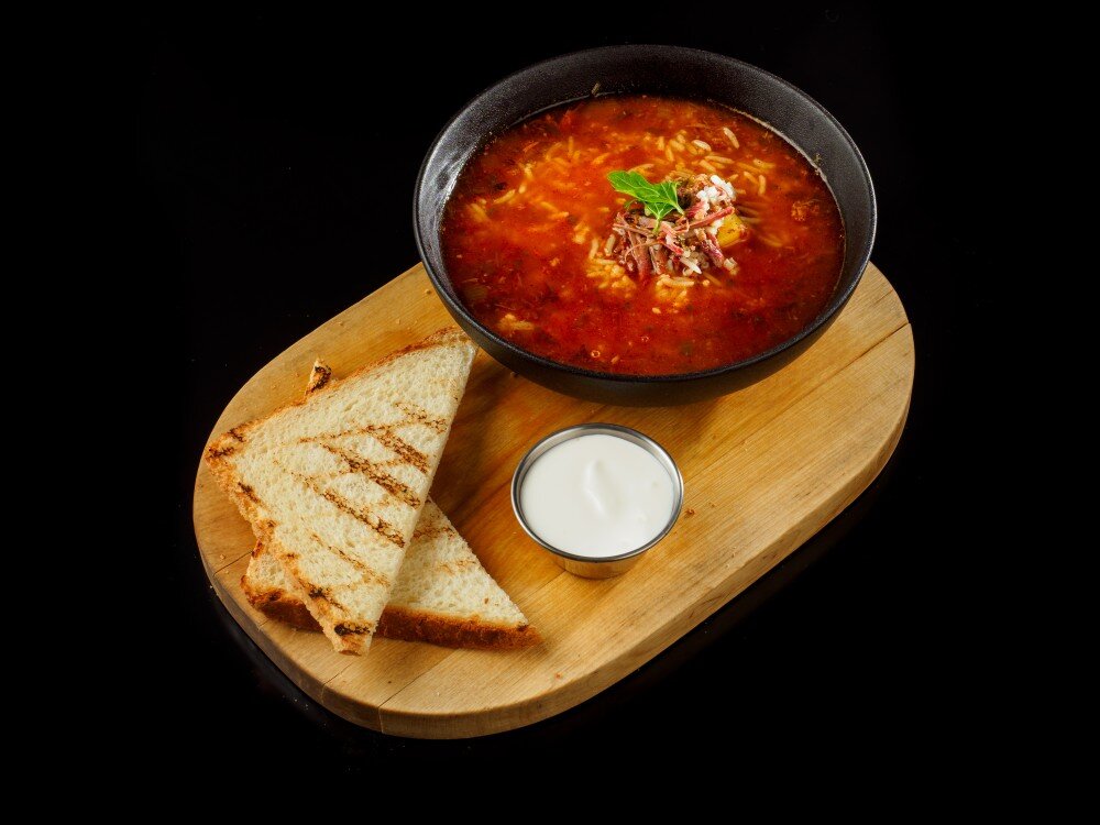 Пряный, умеренно острый суп из баранины с рисом, подаётся со сметаной и кусочками пшеничного хлеба