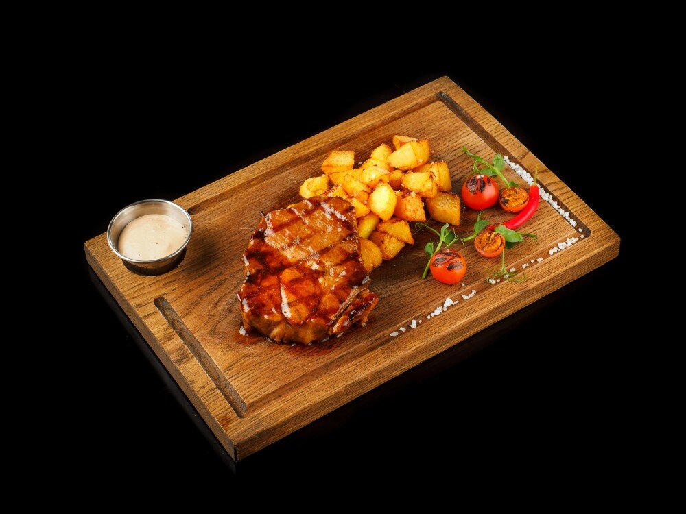 Свинюшкина шея с жареным картофаном и подкопчёным соусом