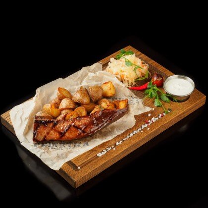 Свинюшкина шея с жареным картофаном и подкопчёным соусом