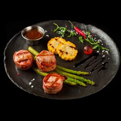 Медальоны из свинины в беконе с зелёной спаржей, кукурузой и соусом