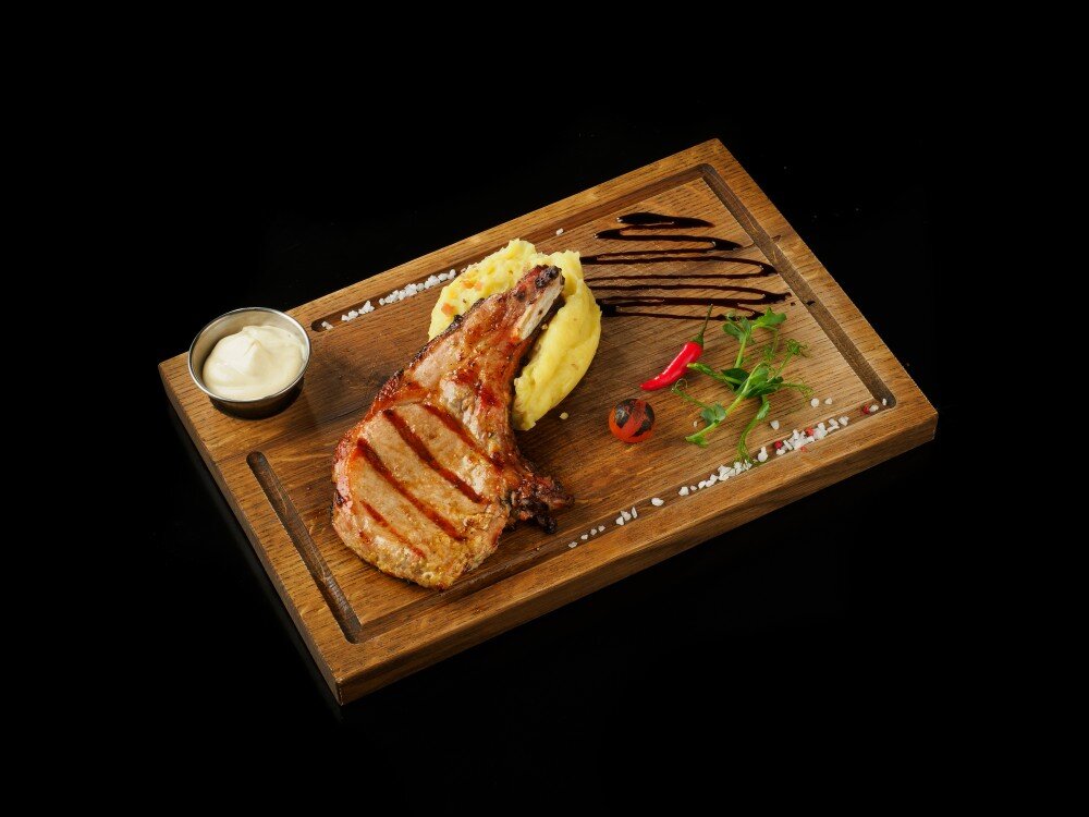 Спинка свинки на кости с горчичным соусом и пюрехой из картохи с беконом и грибами