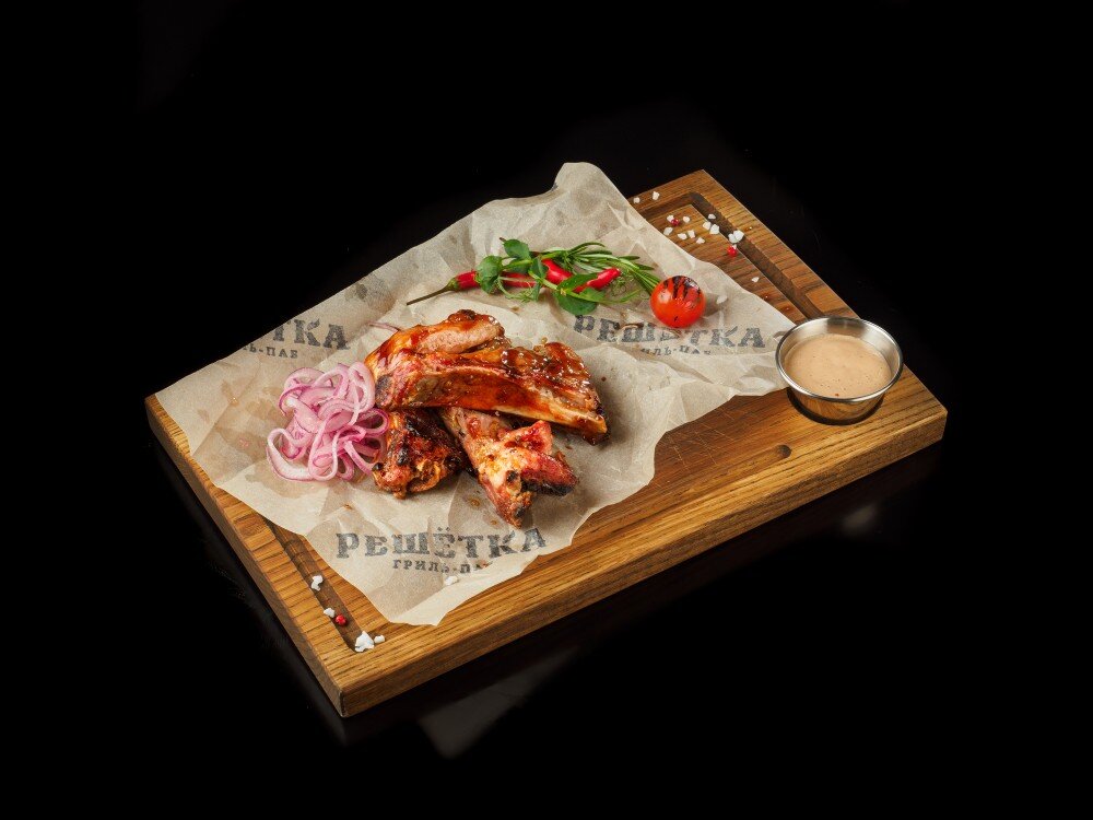 Свиные рёбрышки на гриле с маринованным луком и подкопчённым соусом