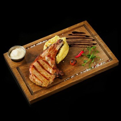 Спинка свинки на кости с горчичным соусом и пюрехой из картохи с беконом и грибами