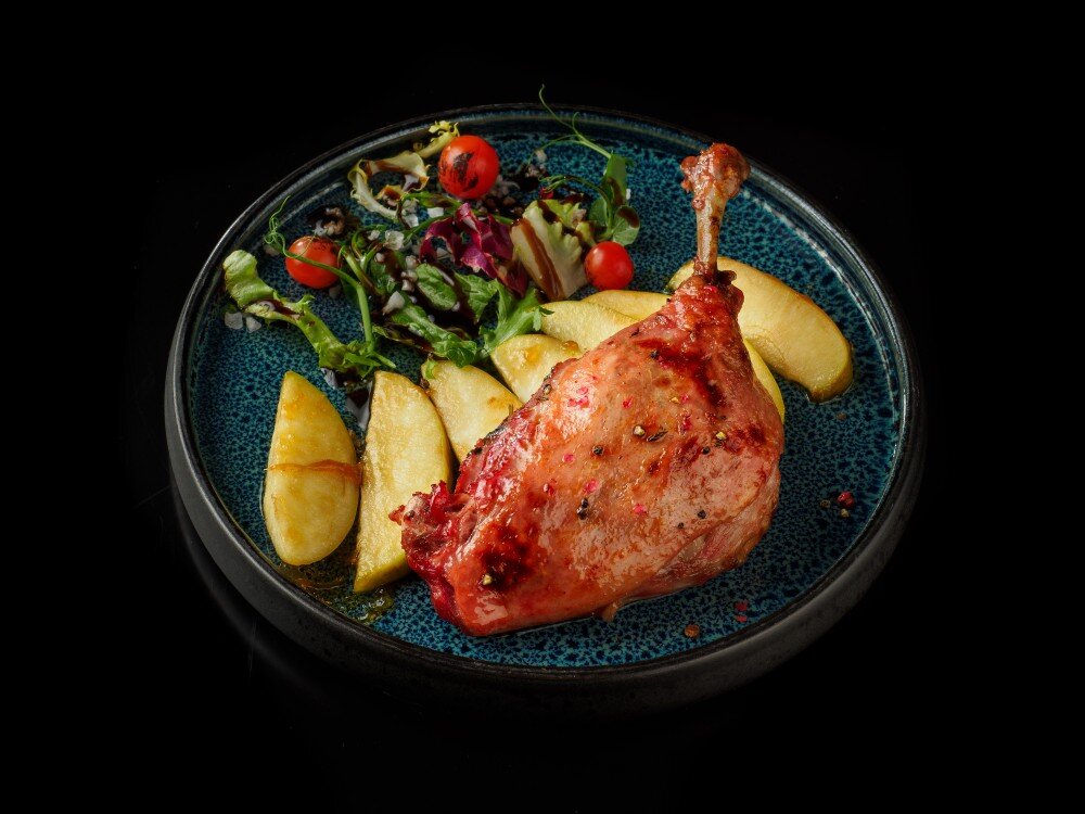 Ножка утки, хрустящая снаружи, нежная внутри (конфи) со смородиновым соусом