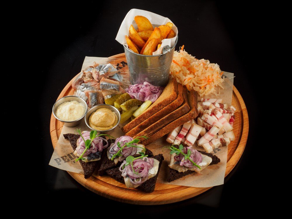 Сельдь и сало собственного посола, квашеная капуста, маринованные огурцы, скумбрия на гренках, картофельные дольки, маринованный лук, чернохлебные тосты, хрен и горчица