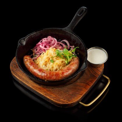 Колбасина из упитанной свиньи с капустой, тушенной в вишневом пиве, и соусом из хрена и сметаны