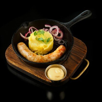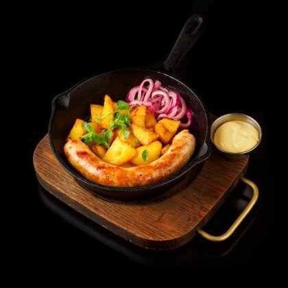 Говяжья колбаса на гриле с картофелем по-деревенски, маринованным луком и подкопчённым соусом