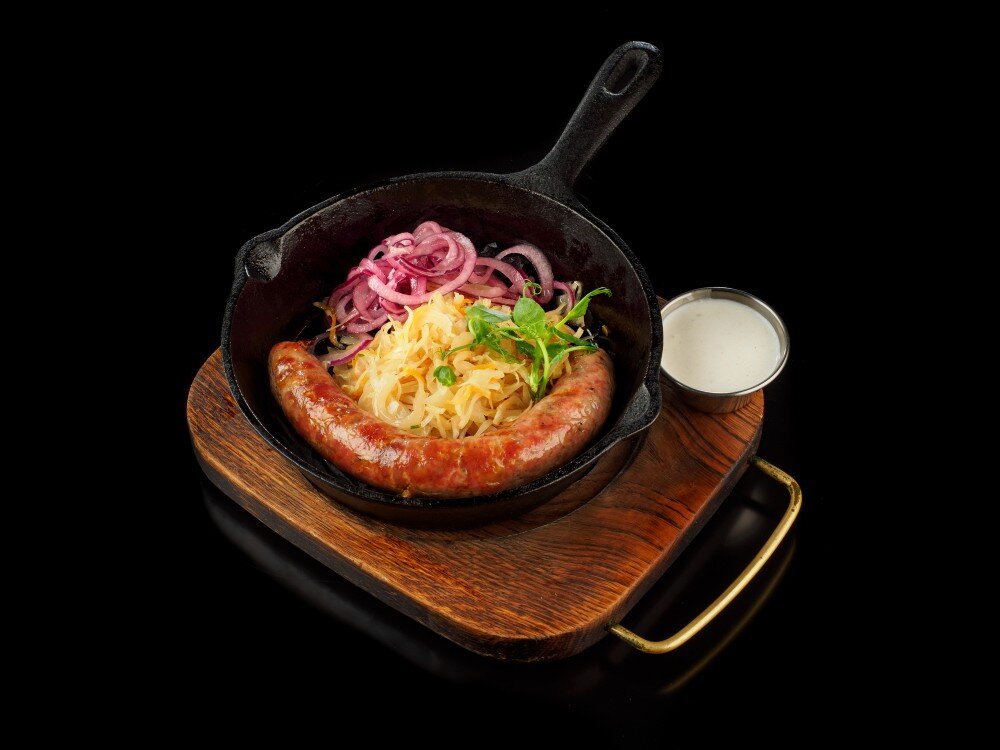 Свиная колбаса на гриле с капустой, тушённой в пиве, маринованным луком и соусом из сметаны и хрена