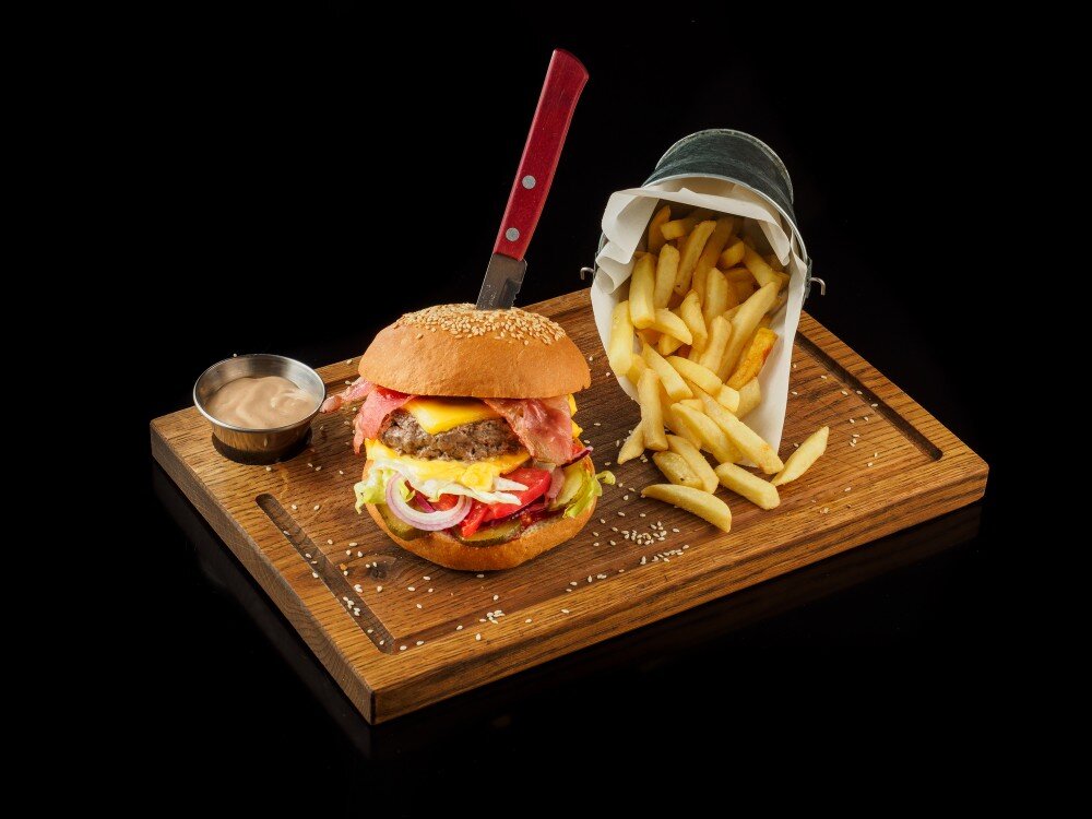 Пшеничная булочка, кетчуп, айсберг, котлета из говядины, бекон, помидор, маринованный огурец, красный лук, сыр чеддер, картофель фри и подкопчённый соус