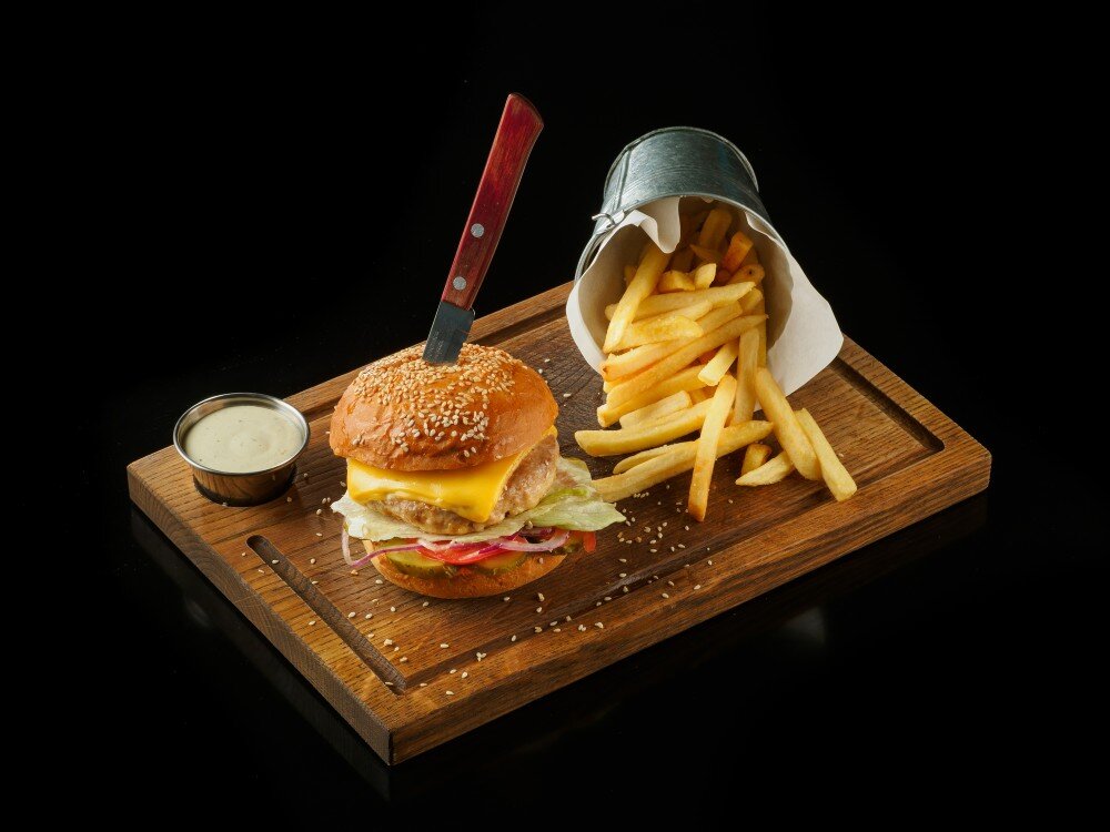 Пшеничная булочка, кетчуп, айсберг, котлета из курицы и индейки, помидор, маринованный огурец, красный лук, сыр чеддер, картофель фри и соус тартар