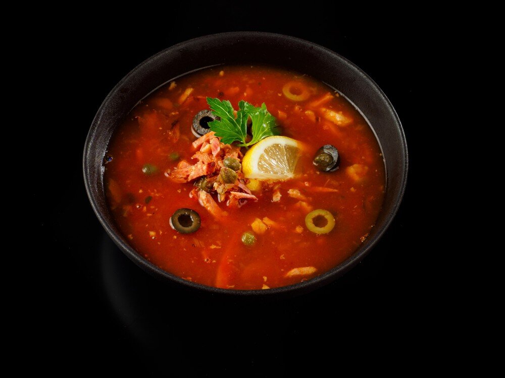 Густой наваристый суп на мясном бульоне с солеными огурцами и несколькими видами мяса, подаётся со сметаной