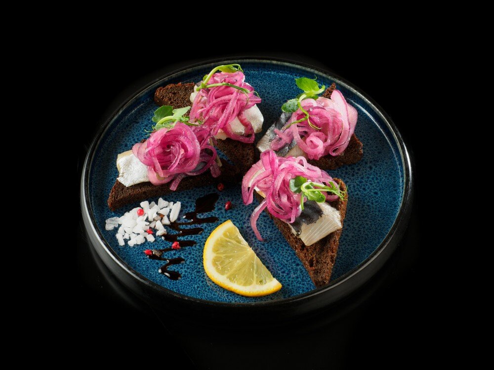 Скумбрия собственного посола на гренках из бородинского хлеба с маринованным луком