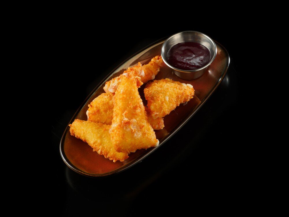 Сулугуни в панировке, обжаренный во фритюре, со смородиновым соусом