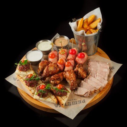 Креветули в кляре, тартар из форели, золотистая мойва, скумбрия на гренках, сыр сулугуни и 3 соуса (тартар, дорблю, кимчи)