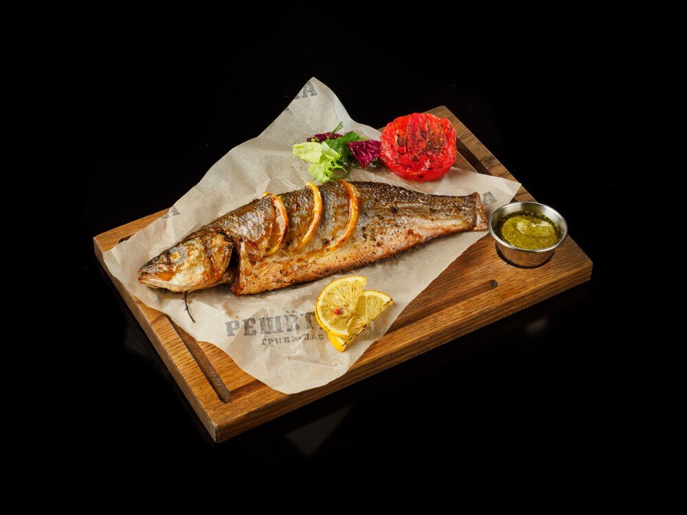 Атлантический сибас с печёным помидором и соусом песто XL