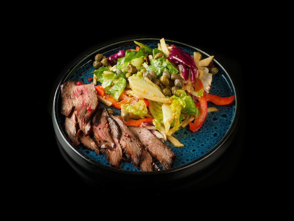 Стейк-салат (тёплый) с мясом бычули, овощами-гриль и устричной заправкой